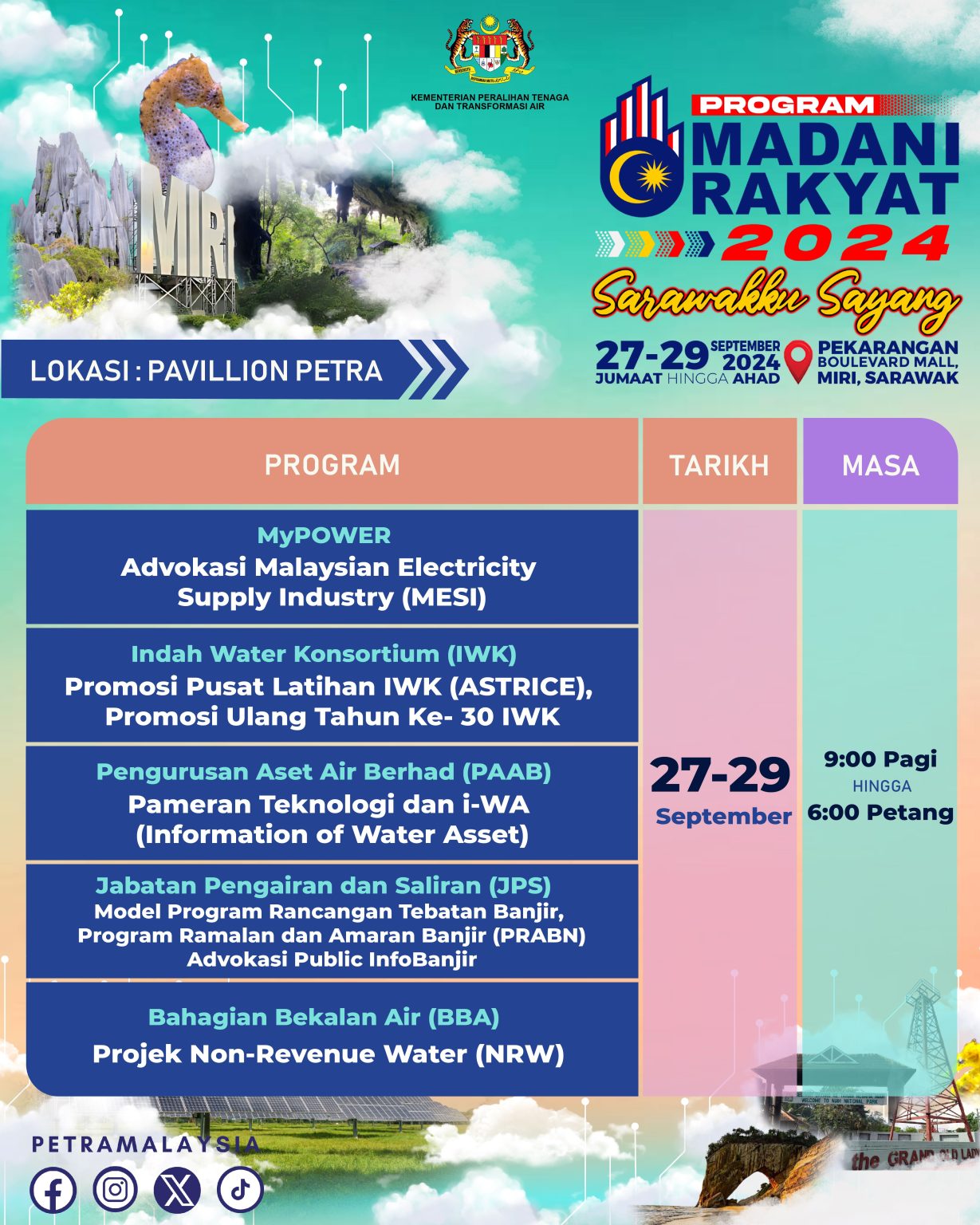 Untuk kali ini, Program MADANI Rakyat 2024 Sarawakku Sayang akan berlangsung di Pekarangan Boulevard Mall, Miri, Sarawak.